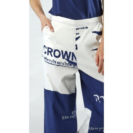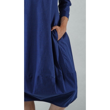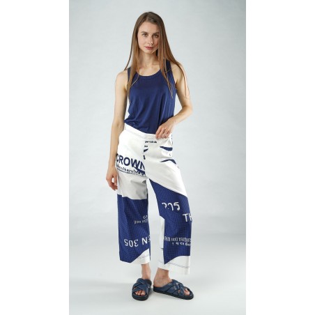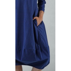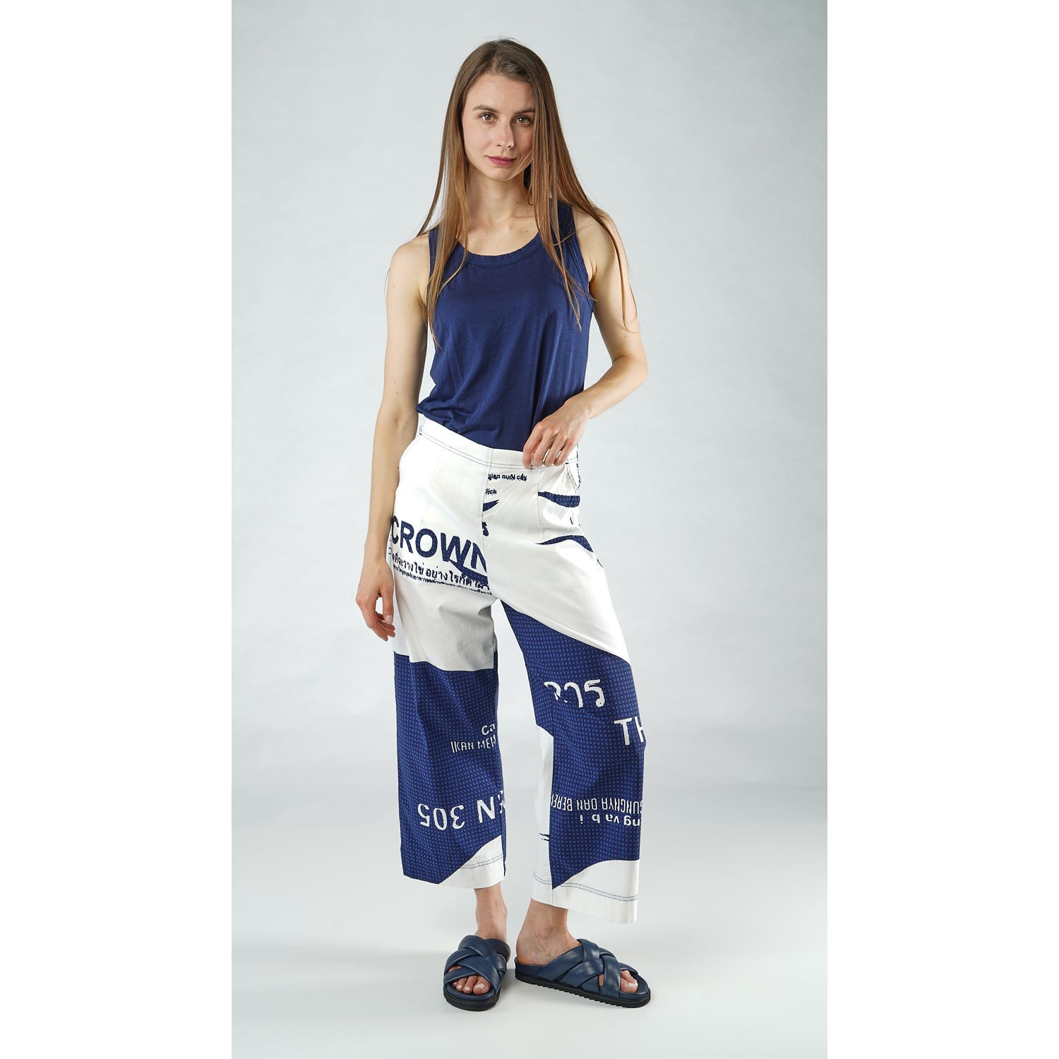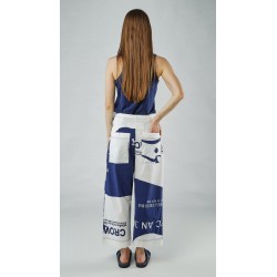 Note that the trousers are shown in navy print but are only available in navy check, as shown on the detail photo of the dress. Also note that the photos show the short version (which is also available; see below), but only the video shows the actual, longer version, although in a different color.