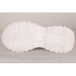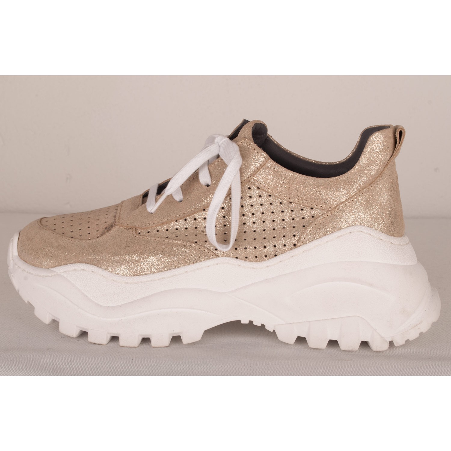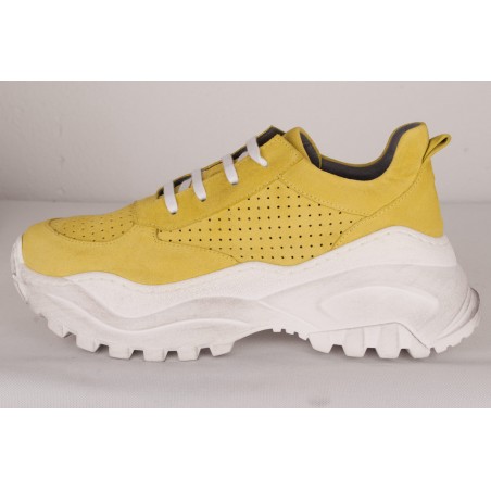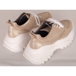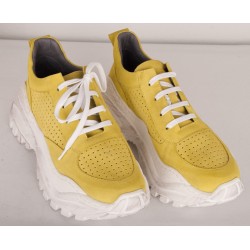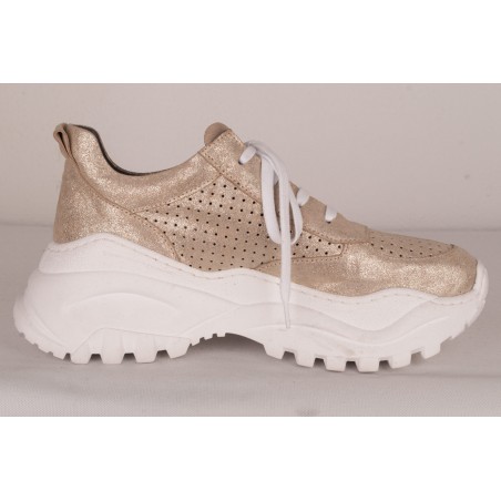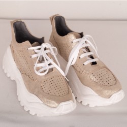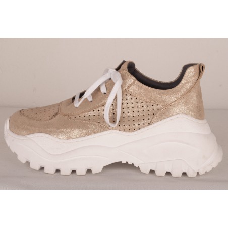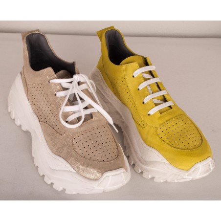 Sneaker style shoe in bright yellow-green or sparkling gold leather versions.