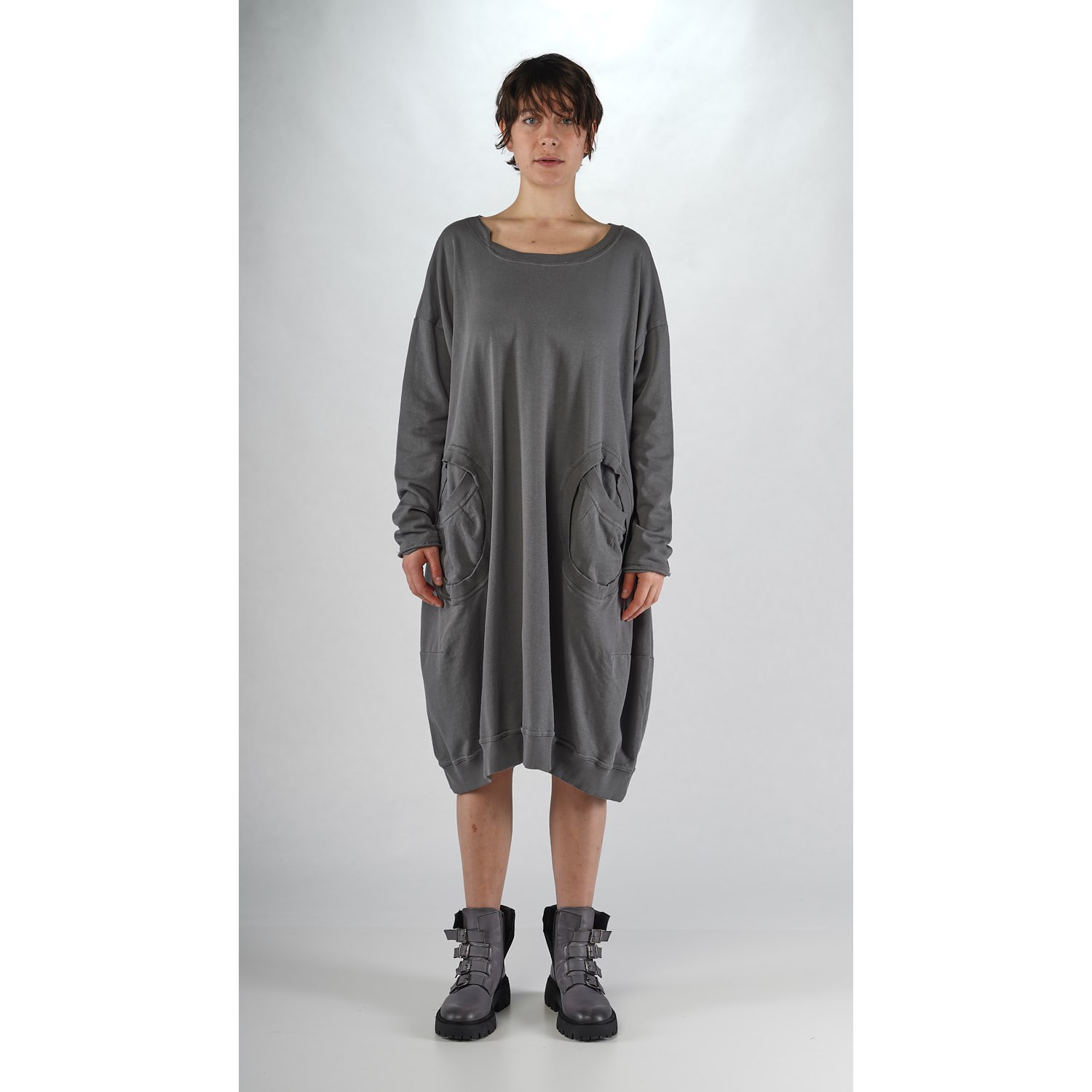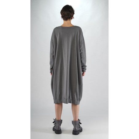 Rundholz Black Label ballonvormige jurk van french terry katoen met twee grote zakken aan de voorkant en een asymmetrische halslijn.