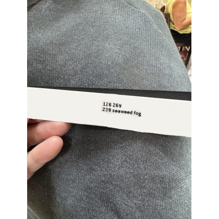 De trui wordt getoond in amber fog, maar is ook verkrijgbaar in seaweed fog, zoals te zien is op de andere detailfoto.