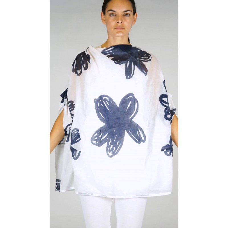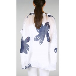 Wit, oversized shirt met print. De fijne katoenen stof is half doorzichtig. Verkrijgbaar in rood of blauw geschetste bloemen.