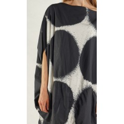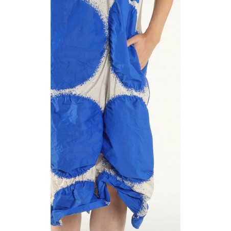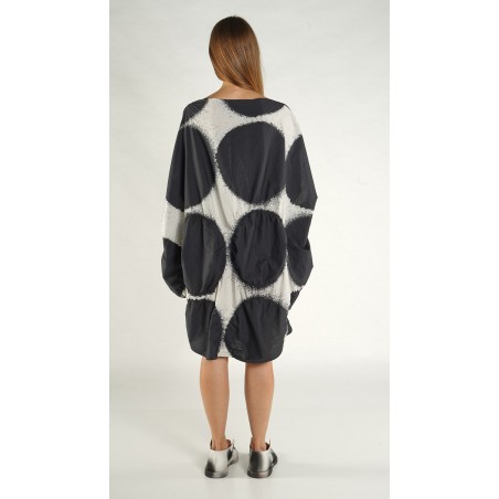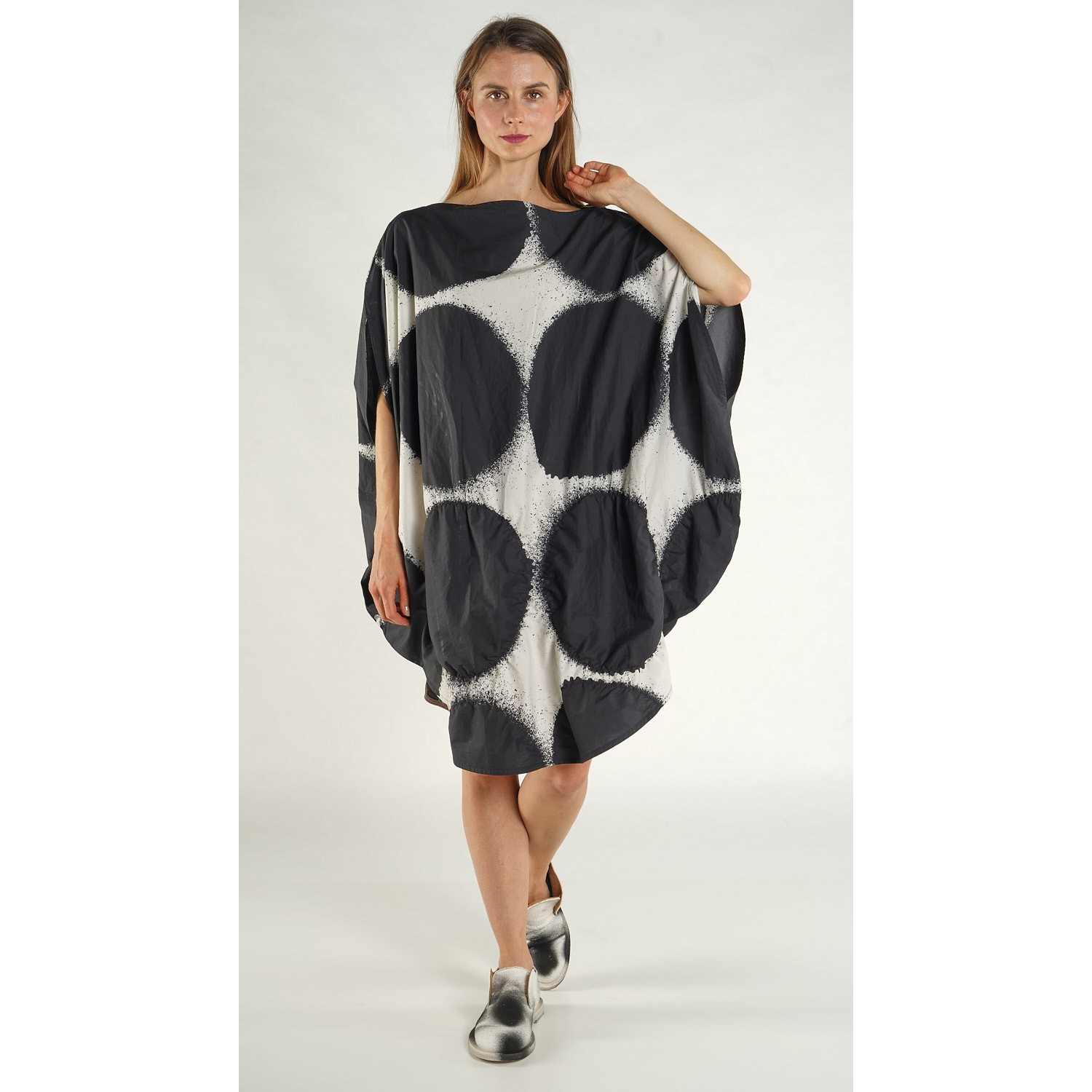 Rundholz ballonvormige one-size jurk van katoenen poplin met overgesneden schouders en een ronde halslijn. De cirkels aan de onderkant zijn opgestikte applicaties.