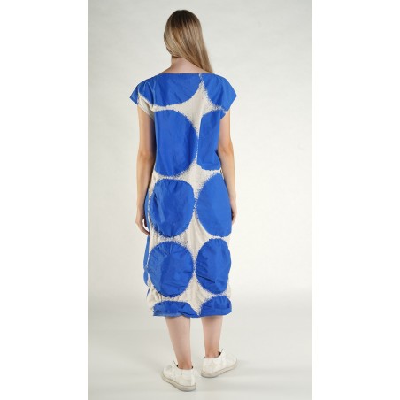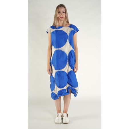 Rundholz rechte, nauwsluitende, mouwloze, asymmetrische jurk van katoenen poplin met ronde hals. De cirkels aan de onderkant zijn opgestikte applicaties.