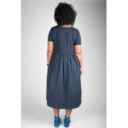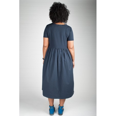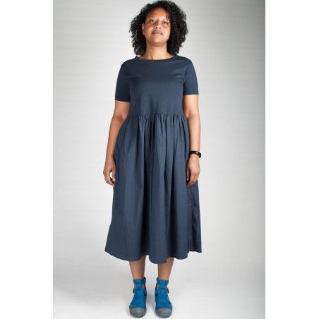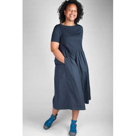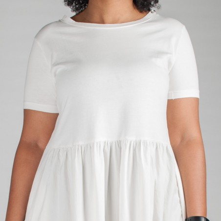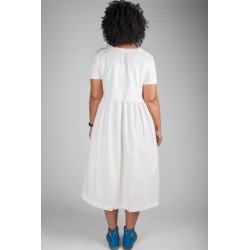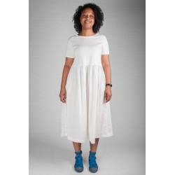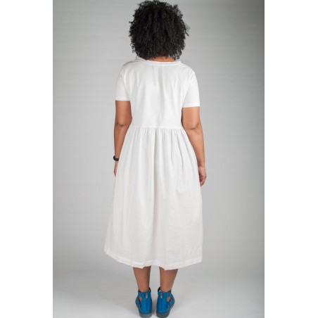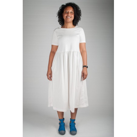 Ruimvallende, halflange jurk met jersey top en rokdeel van 100% katoen. De jurk heeft steekzakken. De jurk is alleen nog beschikbaar in het wit.